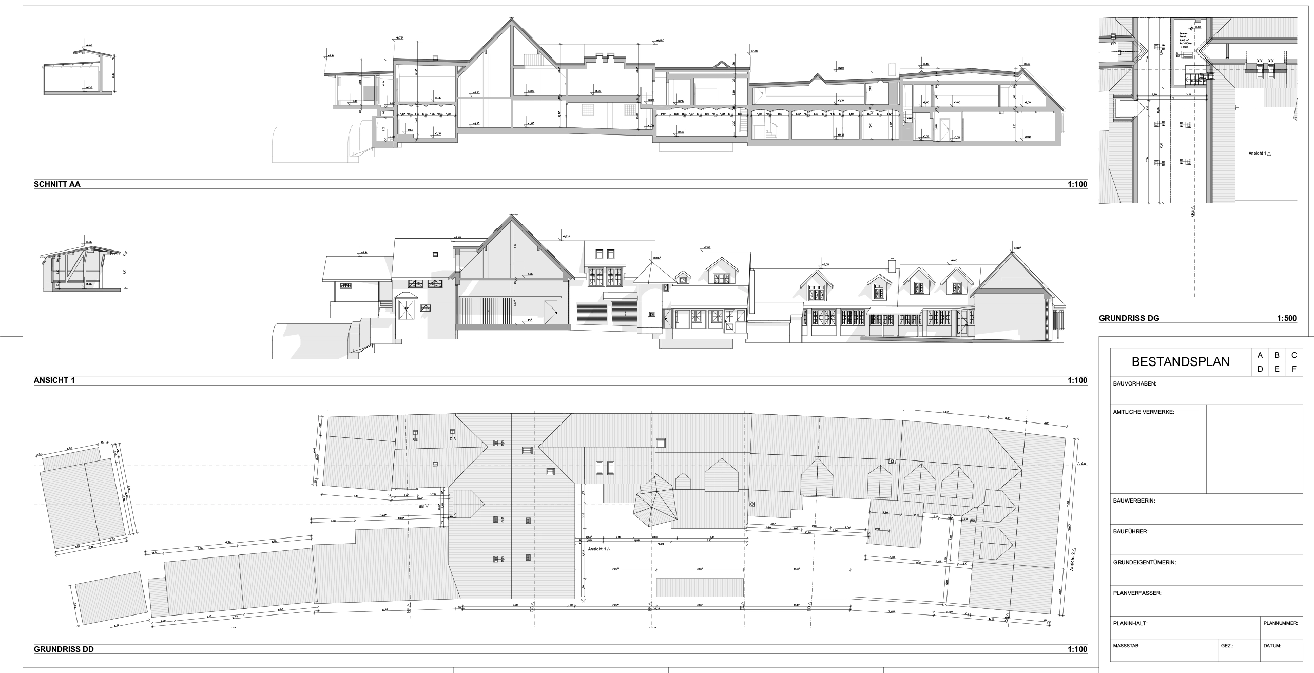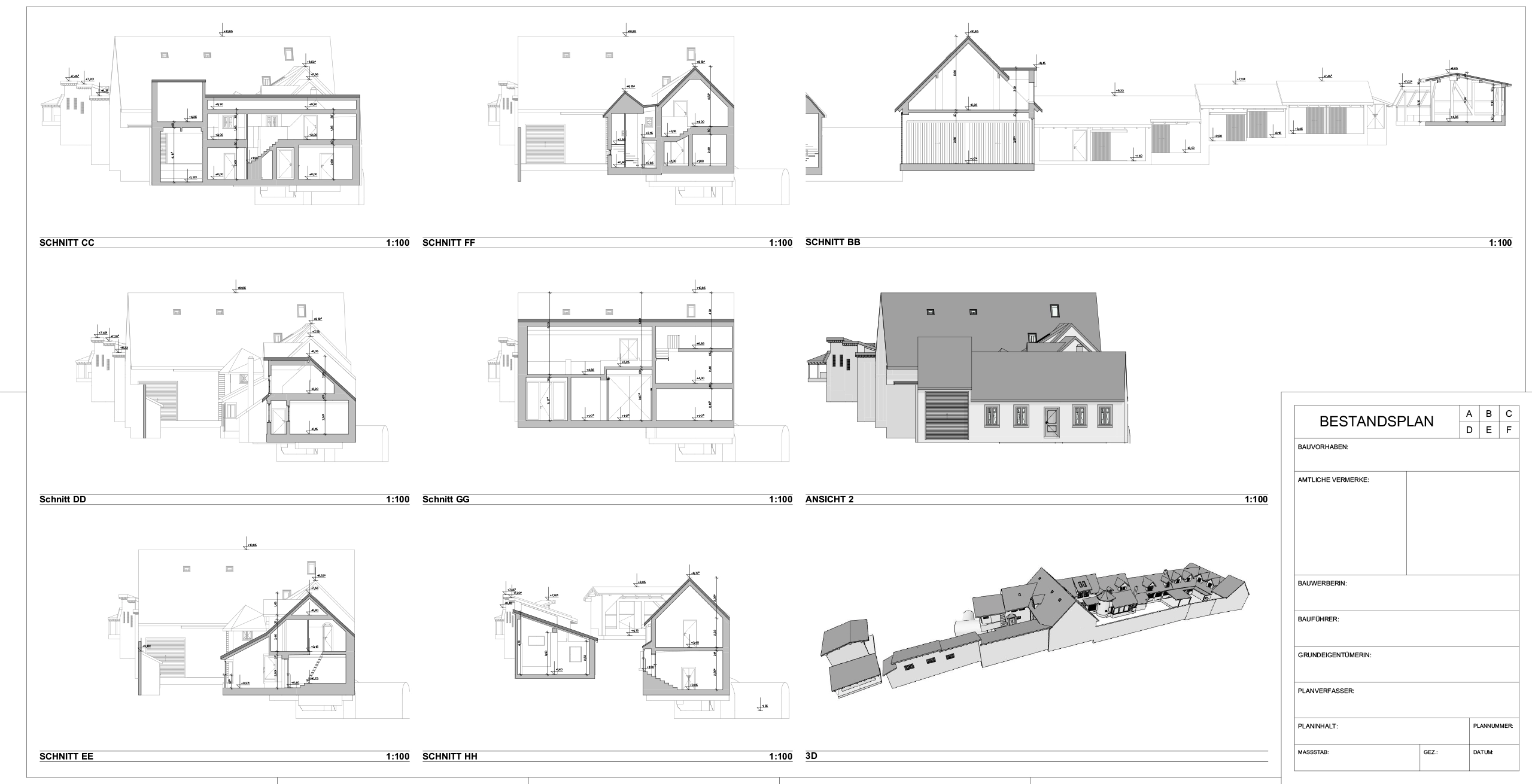 Die erstellten Grundrisse, Schnitte und Ansichten ermöglichen eine verlässliche planerische Weiterverwendung und bieten eine klare, nachvollziehbare Dokumentation des Ist-Zustands. Die Bestandspläne wurden als saubere CAD-Grundlage aufbereitet und eignen sich sowohl für Behördenverfahren als auch für die Weiterbearbeitung durch Architekten, Baumeister oder Fachplaner.